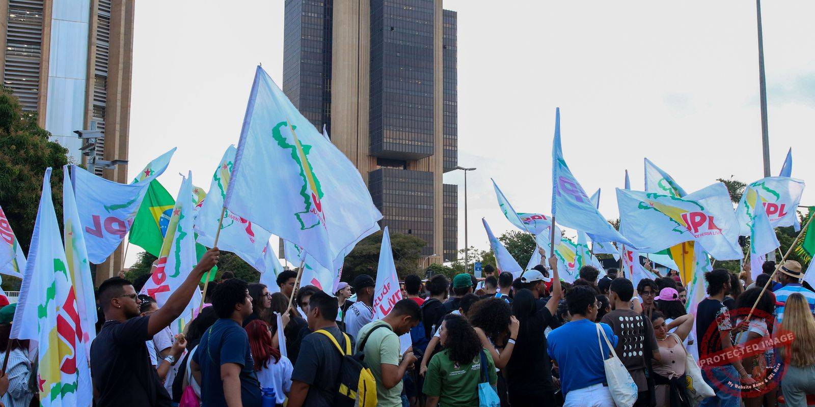 Milhares de participantes do 59ª Congresso Nacional da União Nacional dos Estudantes (UNE) protestaram, nesta sexta-feira (14), em frente ao prédio do Banco Central (BC), em Brasília, pedindo a queda da taxa básica de juros, a Selic.